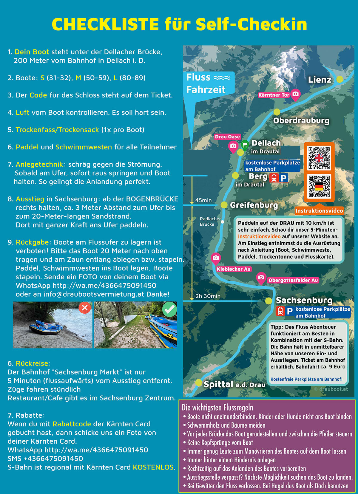 Der Start ist zwischen 10:00 und 15:00 Uhr möglich, die Rückgabe der Boote bitte bis spätestens 19:00 Uhr. Sobald du die Bucht beim Ausstieg erreichst, trage das Boot bitte zum ausgeschilderten Abgabepunkt – etwa 20 Meter oberhalb, am Gehweg beim Zaun. Bitte entsorge deinen Müll selbst. Vielen Dank!
